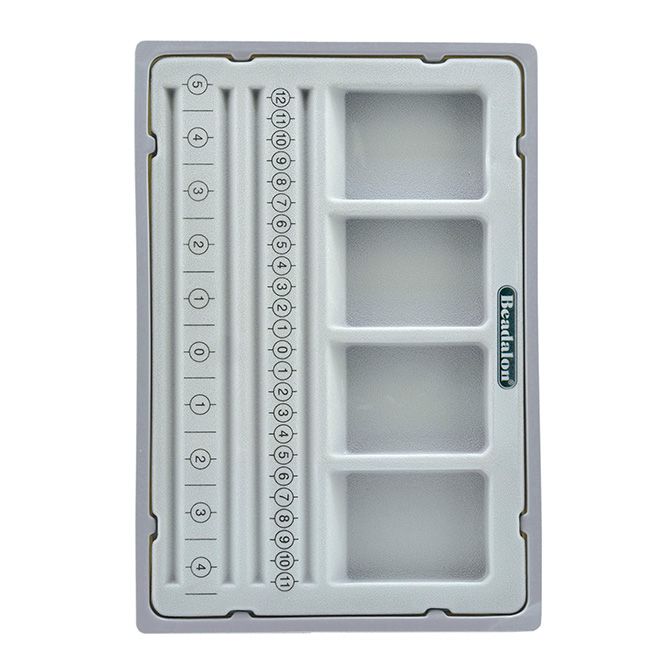 The Bracelet Bead board with cover/tray gives the perfect surface for designing bracelets of varying lengths, it contains four accessory cavities and four designing grooves. The board has inch and centimeter markings, and contains a cover for holding components in the cavities when moving or traveling. Flocked grey plastic provides a good designing surface.